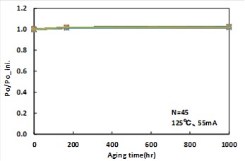 November 26, 2025 Daido Steel Co., Ltd. 红外点光源LED(MED8P系列)绝对最大额定值的变化 为满足市场对高温(超过85℃)环境下应用的需求,我们近期对红外点光源LED(MED8P系列)进行了高温高电流条件下的电特性评估,并进行了1000小时连续电流测试,结果证实其运行稳定。基于这些测试结果,我们将调整相关产品的绝对最大额定值。请注意,绝对最大额定值并不保证产品的长期可靠性。请务必在额定范围内使用产品,并在使用前充分评估其可靠性。 <MED8P53 连续电流测试数据> 检 索 CLOSE